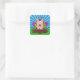Cute pink baby pig happily playing in a pool of brown mud. Behind him are some colourful flowers, green grass and a blue sunburst sky.