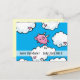 A jolly "Save the Date" postcard proving that pigs do fly and that dreams can come true. A happy little pink pig dances on clouds adorned with hearts against a blue background. Below the pig reads "Save the Date" and has an option for you to personalized both the back and the front of the postcard.