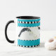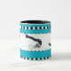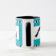 The trio of pilates figures circle a mug in black and white with a checked border. Background colour can be customized.