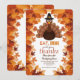 Surrounded by a frame of autumn leaves, this cute little turkey is wearing a Pilgrim hat. He's perfect for inviting guest to a Thanksgiving celebration. (<a href="http://www.freepik.com/free-vector/background-of-leaves-with-nice-thanksgiving-turkey_954156.htm">Designed by Freepik</a>). <br/><br/>The card is easy to customize with your wording, font, font colour, paper shape options and choice of six paper types.<br/><br/>Not exactly what you're looking for? All our products can be custom designed to meet your needs at no extra charge.<br/><br/>Simply contact us at askcottonlamb@gmail.com.<br/><br/>Coordinating products available: Just ask us!