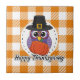 Pilgrim owl on an orange white buffalo plaid pattern background with caption "Happy Thanksgiving".
