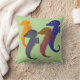 Seahorses in four different colours (blue, grey, brownish-red, and orange) on Light green background.