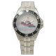 Has heft and feel of expensive stainless steel quartz watches. Good band with safety catch. I removed links, which is easy because engraved arrows show direction to push the linking pins. As always by this seller, the image (a railroad logo) is a perfect reproduction of my emailed image, and is precisely spaced and aligned.