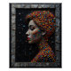 The entire composition creates an illusion of countless colorful pin heads shaping the portrait, set against a stark dark background—black or deep grey—to make the vibrant colors pop vividly. The border mimics a cracked marble or textured stone, embroidered with variegated grey, white, and earthy threads using chain stitch, split stitch, or couched lines to depict crack patterns, framing the intense mosaic of colors and textures. This piece combines playful, sculptural beauty with intricate craftsmanship, emphasizing rich texture, vibrant mosaic effects, and a unique, tactile visual impact."