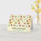 Christmas card with a cute pattern featuring pine cones and holly on a yellow watercolor background with little white circles scattered around.