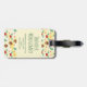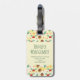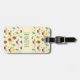 A luggage tag with a cute pattern featuring pine cones and holly on a yellow watercolor background with little white circles scattered around.