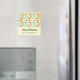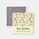 A Merry Christmas magnet with a cute pattern featuring pine cones and holly on a yellow watercolor background with little white circles scattered around.