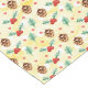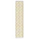 A table runner with a cute Christmas pattern featuring pine cones and holly on a yellow watercolor background with little white circles scattered around.