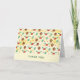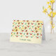 Thank you card with a cute pattern featuring pine cones and holly on a yellow watercolor background with little white circles scattered around.