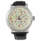 A watch with a cute pattern featuring pine cones and holly on a yellow watercolor background with little white circles scattered around.