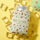 Can cooler with a cute pattern featuring pine cones and holly on a yellow watercolor background with little white circles scattered around.