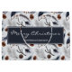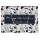 Large gift bag with a beautiful pattern. Pine cones, feathers, pine needles and berry sprigs. Rustic watercolor design. Merry Christmas and a personalized name written in a dark blue frame in the centre.