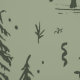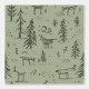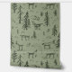 Simple hand-drawn outline sketches of scenes of cute deer in a pine tree forest near a lake set on a solid sage green background. This design has a fixed background, but the size and position of the pattern can be changed.