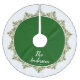 This Christmas tree skirt offers a watercolor graphic of pine branches accented with sprigs of red berries. The graphic appears in the circular pattern. Handwritten style text allows you to add your family and and year.