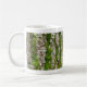 Vibrant green moss grows in vertical grooves of faded pine tree bark. The macro photograph shows the alternating stripes of bark and moss as well as the texture of each. The bark is layered, scaly, with fine gradations of colour: greys, browns, and even pale green. The moss is comprised of myriad short fine hairs, as though the tree wanted some green fur highlights.