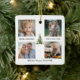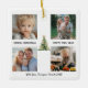 Watercolor Pine Tree with elegant gold bows in the center surrounded by personalized collage of 4 Photos, Family Name and year in Script calligraphy towards bottom. This is an Elegant, Modern, Holiday Christmas Ornament!