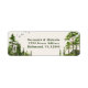 Evergreen trees frame your return address information; with a flock of birds flying overhead. Relaxing nature scene with bold, forest green text.