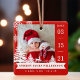 New baby birth stats photo Christmas ornament. The design features two photos, one photo on the front and one on the back. Display your new baby's photo. The date of birth is displayed along the side and the baby's name and birth stats along the bottom. A red background with white snowflakes, pine trees, and deer is added along the bottom of the photo. **Please note you can change the background colour by clicking on edit using the design tool. The reverse side features a place to add a second photo. White snowflakes, trees, and deer are added as well. design by Moodthology Papery
