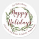 Minimalist Happy Holidays Watercolor Pine and Berries Wreath Classic Round Sticker. Personalize by adding your family name and address and enjoy!