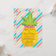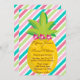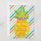 A tropical delight, this pineapple and rainbow stripes wedding invitation features a pink and blue diagonal striped background with a yellow pineapple placed in the middle of the wedding invitation. Ceremony information is written inside of the pineapple using black font. Perfect for a summer wedding, purchase these lovely wedding invitations today!