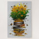 This playful and vibrant graphic design features a stack of yellow books arranged in the shape of a pineapple. The books are stacked wildly, but the topmost book is bursting with energy, releasing a burst of green and yellow juice that splashes outward. Small books are popping out from the juice blast, adding a sense of movement and fun. The entire composition cleverly mimics the look of a pineapple, blending the love for reading with the tropical charm of this iconic fruit. It's a perfect design for book lovers with a creative flair for the whimsical!