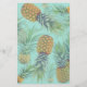 Holiday family dinner menu template with a tropical theme. Pineapples design with two areas for custom text in aqua blue colour. Ecru cards have a single pineapple at the top with ornaments and a little starfish. Family name / names with title and date is beneath the image in elegant script. Print all the menu selections below and include the names of the bakers and chefs if you want. This design may not work on all sizes. The menu will print as you see it in the preview!