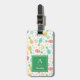 Colourful luggage tag featuring a pattern of pineapples, pineapple slices, and pineapple chunks in coral pink, turquoise and yellow against a white background. On the pineapple pattern, there's a green label where you can add your initial and name. The back has a green and white striped pattern. Cute personalized luggage tag, perfect for tropical vacations and summer holidays.