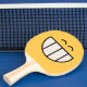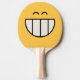Cette batte de ping-pong a un visage drôle là-dessus avec une grande grimace de fromage. Elle est l'une d'une série de raquettes heureuses de ping-pong de visage que vous pouvez acheter de Superkalifragilistic.