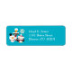 Voici un joli label d'adresse de retour pour la saison des Fêtes ! Il comporte un manchot de dessin animé et un bonhomme de neige debout devant un poteau rayé rouge et blanc avec un panneau indiquant le pôle Nord. Votre texte personnalisé est en bleu clair. Les images et le texte sont placés sur un arrière - plan bleu ciel brillant. *L'image clipart utilisée dans cette conception est protégée par le droit d'auteur de Encore Software, Inc., qui permet son utilisation à ses concédants de licence. Tous droits réservés.