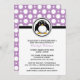 Des invitations élégantes et mignonnes à la douche pour bébés, conçues dans un motif assorti de pois violets et blancs, avec un adorable petit manchot noir arrondi, et imprimées sur mesure avec vos détails de fête.