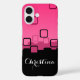 This abstract personalized phone case features some black rounded squares drifting on a pink gradient background. What's going on? I don't know; it's just bold, colourful art! You can add your own name, which appears in white with a fancy script.