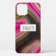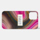 A phone case with a groovy looking abstract design. Pink and black colours mix and mingle together in a swirling motion. Sprinkles of faux gold glitter in between the layers. A white rectangle frame with a faux gold foil border, layered over top with your personalized text inside.