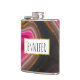 A flask with a groovy looking abstract design. Pink and black colours mix and mingle together in a swirling motion. Sprinkles of faux gold glitter in between the layers. A white rectangle frame with a faux gold foil border, layered over top with your personalized text inside.