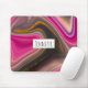 A mouse pad with a groovy looking abstract design. Pink and black colours mix and mingle together in a swirling motion. Sprinkles of faux gold glitter in between the layers. A white rectangle frame with a faux gold foil border, layered over top with your personalized text inside.