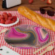 Paper plates with a groovy looking abstract design. Pink and black colours mix and mingle together in a swirling motion. Sprinkles of faux gold glitter in between the layers.