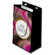 Happy Birthday gift bag with a groovy looking abstract design. Pink and black colours mix and mingle together in a swirling motion. Sprinkles of faux gold glitter in between the layers. A white circle frame with a faux gold foil border, layered over top with your personalized text inside.