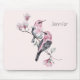 A mouse pad with a watercolor painting. 2 pink and black birds sitting on a tree branch with pink blossoms.