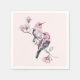 Paper napkins with a watercolor painting. 2 pink and black birds sitting on a tree branch with pink blossoms.