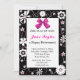 An elegant black invitation perfect for any woman retiring. It features a white centre with a black border around the edge. The border has whimsical white and pink flowers. A graphic of a pink bow sits at the top. You customize all text.