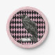 This pink and black Halloween Paper Plate features a victorian pink damask design around the edge with black and pink harlequin pattern in the centre with a black raven sitting on a perch.