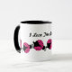 Fun pink and black "I love the beetles" pink ladybug coffee mug.
