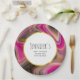 Baby shower paper plates with a groovy looking abstract design. Pink and black colours mix and mingle together in a swirling motion. Sprinkles of faux gold glitter in between the layers. A white circle frame with a faux gold foil border, layered over top with your personalized text inside.