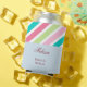 Pink and Blue bride to be can cooler is a one of a kind koozie for your bridal shower party. The front top half features pink blue and green diagonal stripes and the bottom half displays blue background. The bride's information is in customizable pink font.