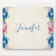 Personalized mousepad with a frame of pink and blue wildflowers, posies and pansies with various sprigs and leaves. Colourful and bright. The centre is a faux parchment image. Soft and summery.