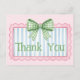 This cute thank you postcard features a pink frame with blue and white stripes and topped with a preppy green and white gingham plaid bow. Personalize with your choice of special text.