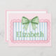 This cute note card features a pink frame with blue and white stripes and topped with a preppy green and white gingham plaid bow. Personalize with your choice of name or special text.