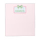 This cute notepad features a pink frame with blue and white stripes and topped with a preppy green and white gingham plaid bow. Personalize with your choice of name or special text. Fun for personalized gift bags and party favors.