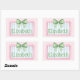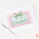 This cute rectangle sticker features a pink frame with blue and white stripes and topped with a preppy green and white gingham plaid bow on a background of pink and white polka dots. Personalize with your choice of name or special text.