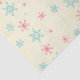Tissue paper with a cold and wintery christmas pattern. A repeating pattern of pink and blue snowflakes set on a cream coloured background. A seasonal winter time holiday design.