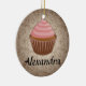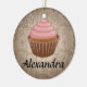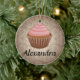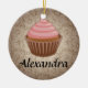 Pretty keepsake ornament features a pretty iced cupcake in pink with a mocha tan / brown paper wrapper cup and brown damask background. Perfect for the cupcake business shoppe, baker, or lady who loves baking goodies and sweets